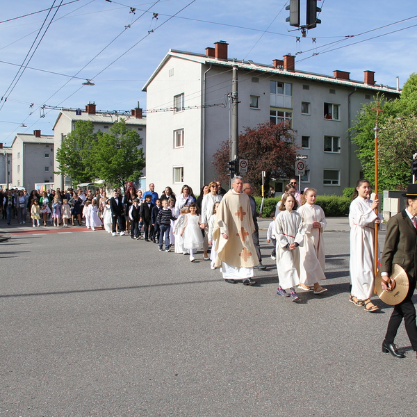 Bei strahlendem Sonnenschein und begleitet von der Musikkapelle zog ein langer Festzug vom Volkshaus zur Kirche, um gemeinsam mit 16 Kindern unserer Pfarre zu feiern, dass sie zum 1. Mal die Kommunion empfangen durften.